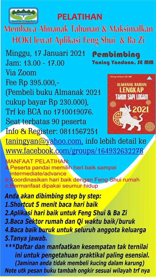 Fee : Rp 395.000,- (sudah termasuk buku Almanak Harian tahun sapi logam 2021) + ongkir Rp 10 rb area Jabotabek, Rp 20 rb area Jawa, Rp 30 rb luar Jawa.